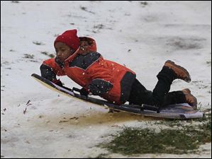 Brandon Sims, 9, hits a ramp some of the sledders created on the hill while sledding down one of the hills in Ottawa Park in Toledo.