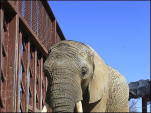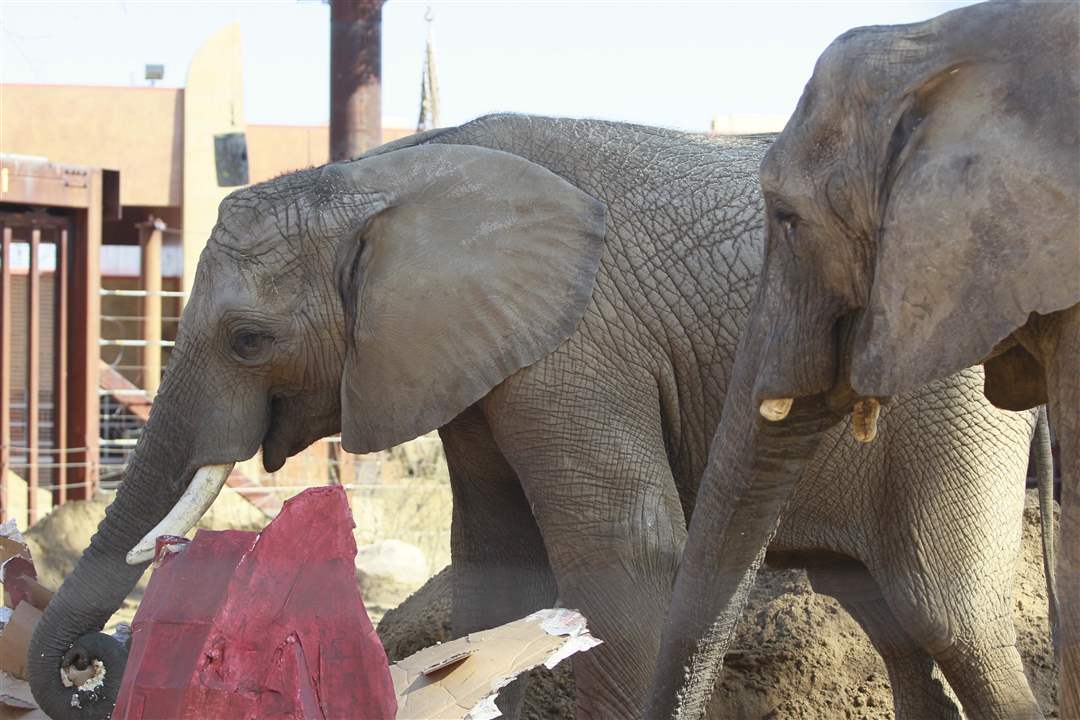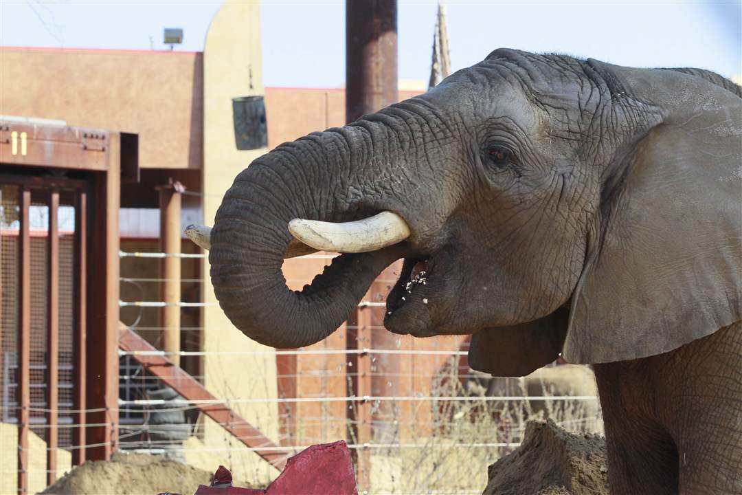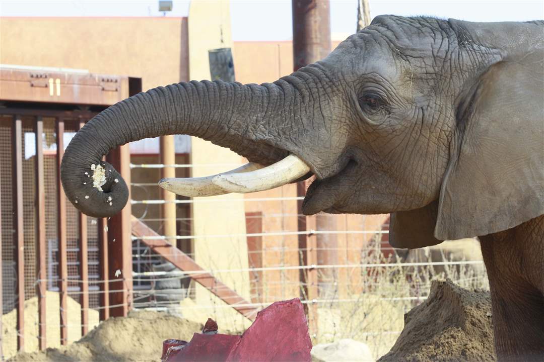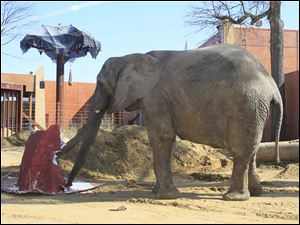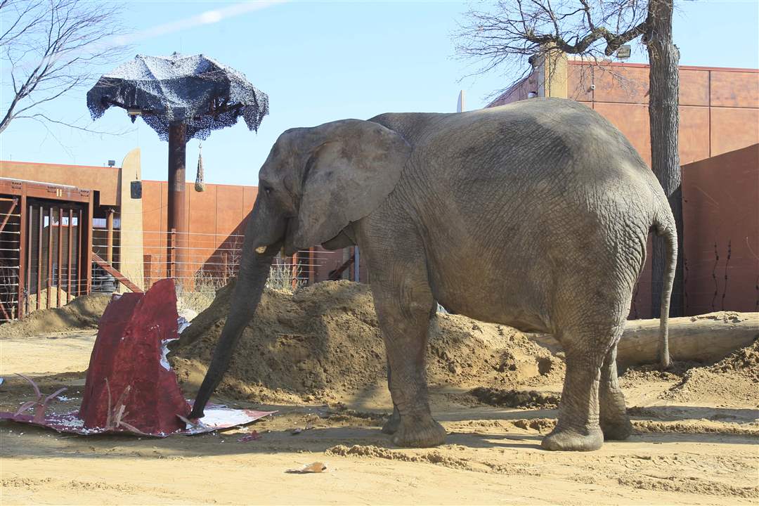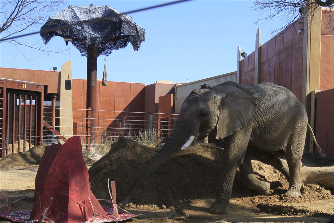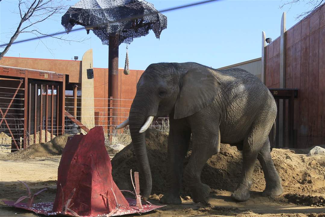 Twiggy, a female elephant given given to the Zoo by the U.S. Department of Agriculture after her former owner could no longer provide the care she needed, shares Louie's birthday cake.