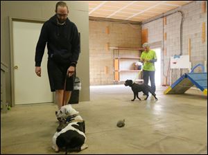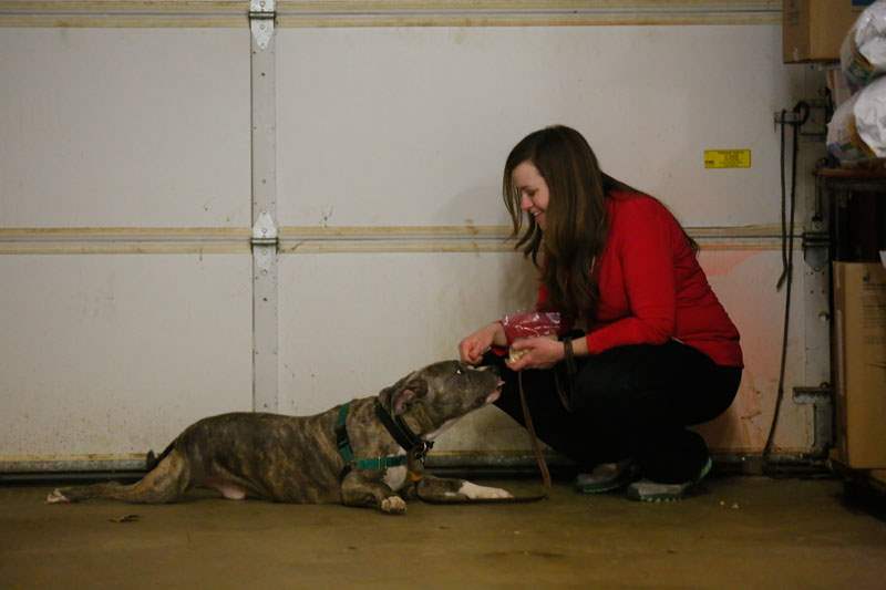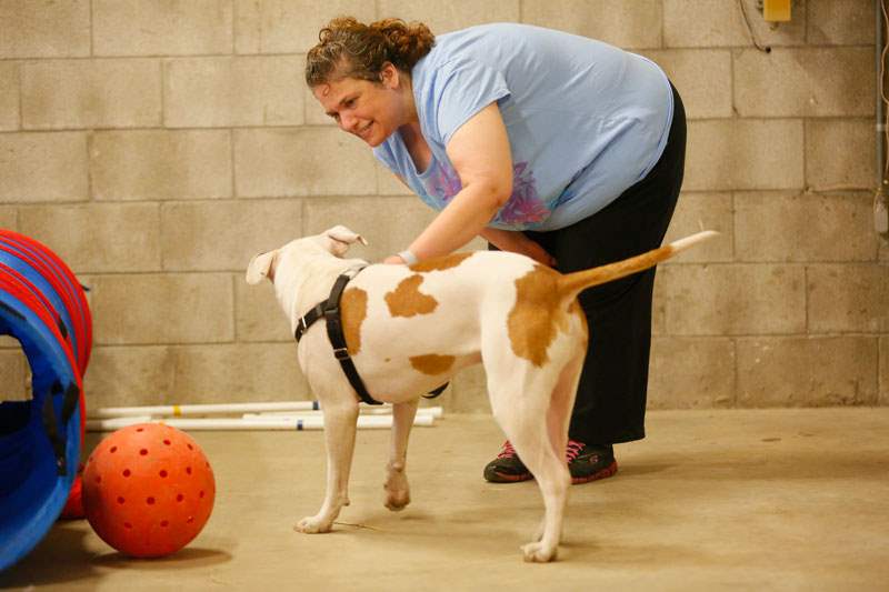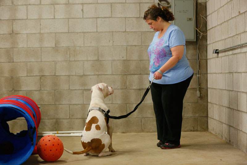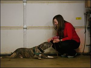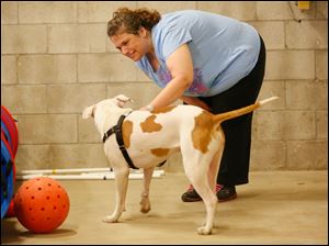 Volunteer Amy Roth of Toledo trains her foster dog, a "pit bull" mix named "Mr. Jenkins."