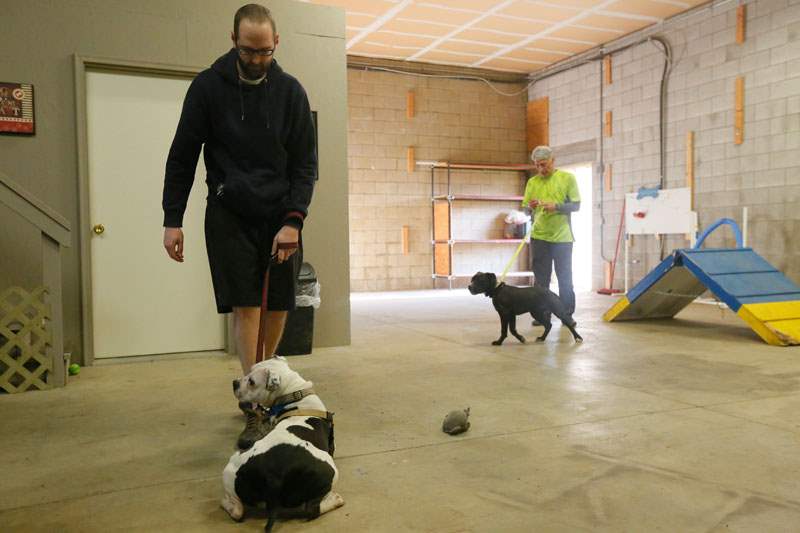 Volunteer Jeff Eloff trains a foster "pit bull" mix named "Squiggy."