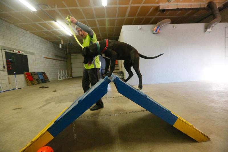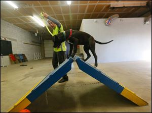 Volunteer Angie Watterson of Toledo trains her foster "Chief," a "pit bull" mix.