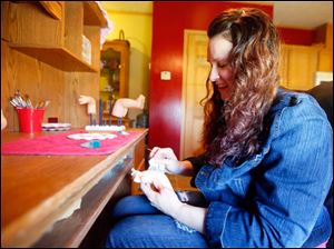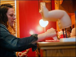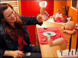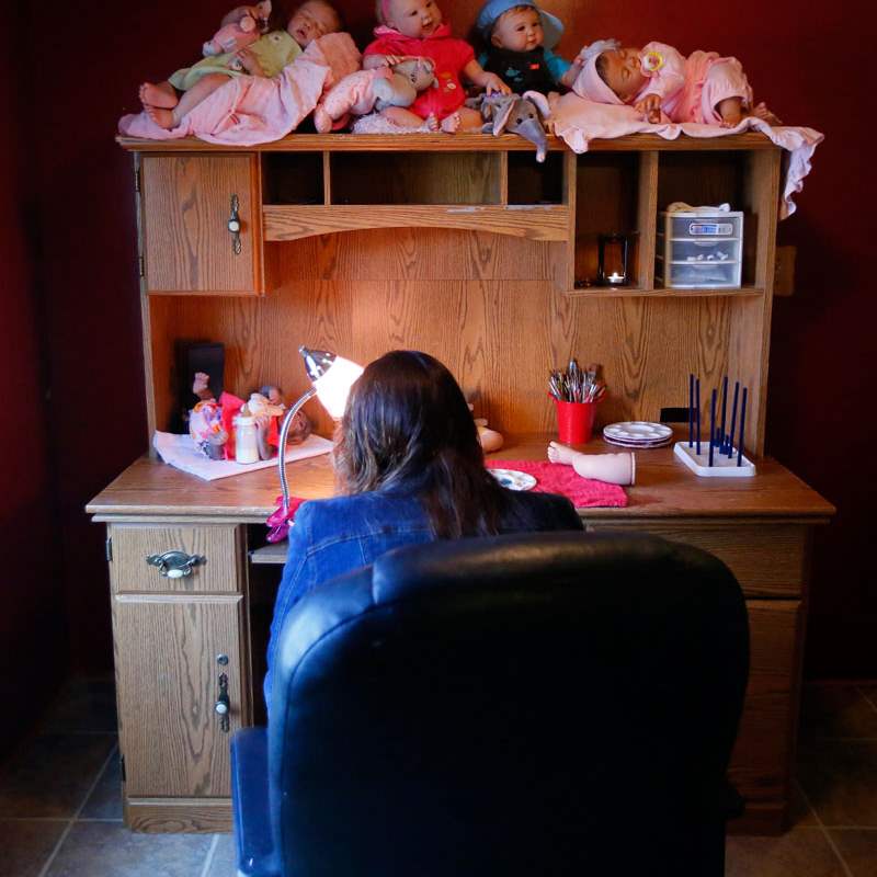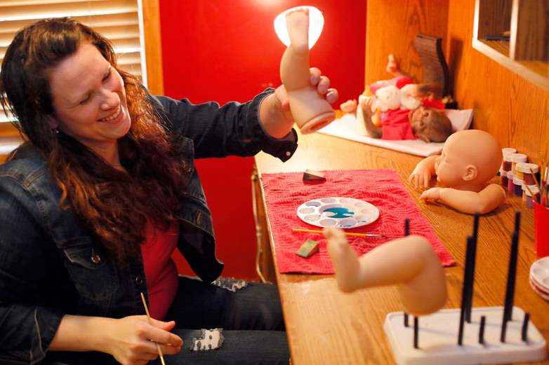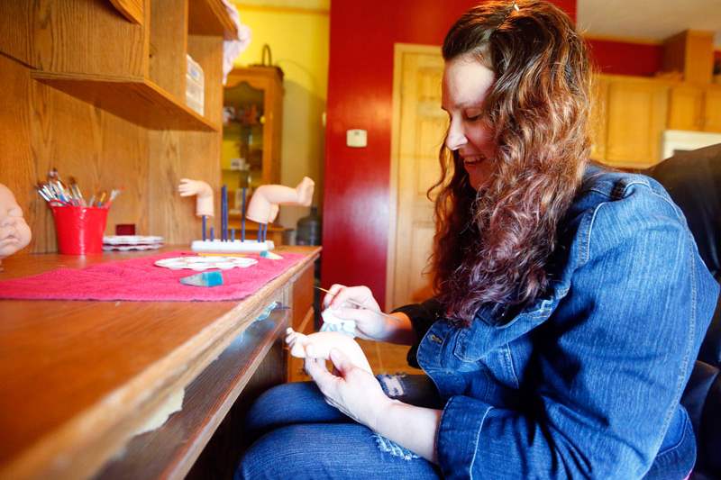 Jennifer Neal works to make a baby doll at her desk in her home business called Reborn Nursery in Elmore.
