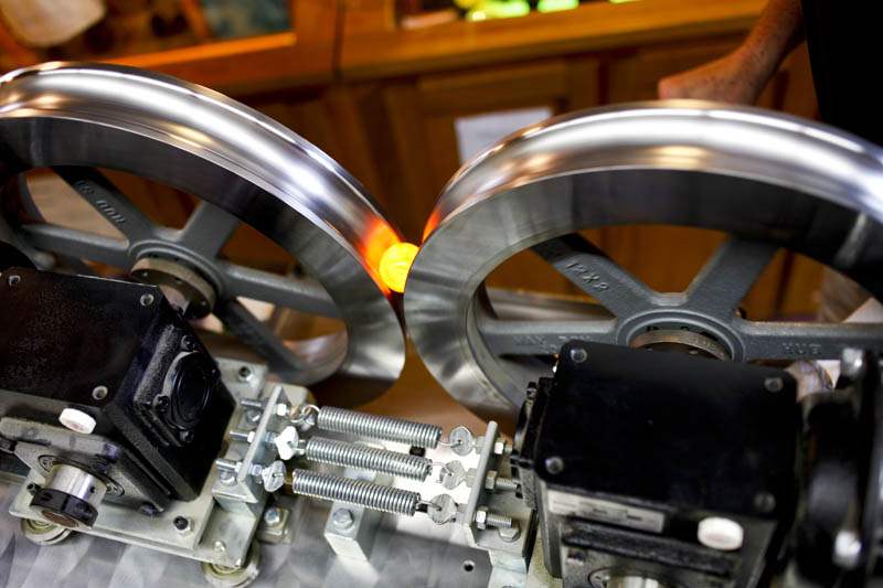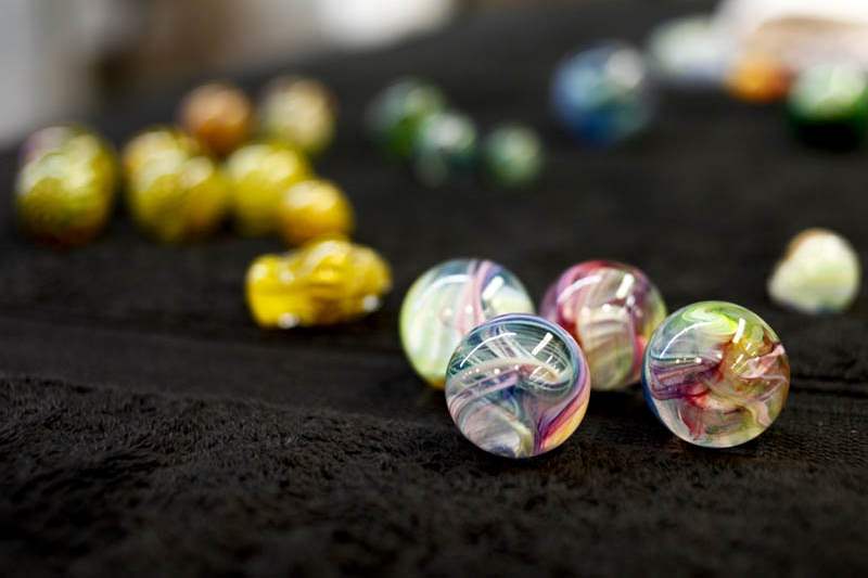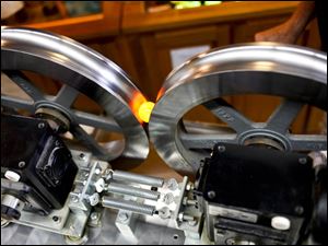 A marble is made using a modern reproduction of the first mechanized sphere making machine.
