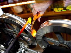 Glass artist Mark Matthews of Wauseon uses a blow torch help shape the glass.