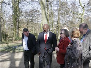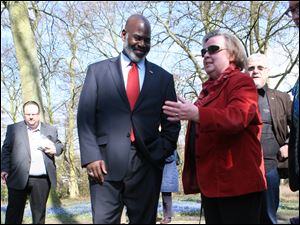 Anke von Wittke-Grothenn, right, explains the marker which shows the location of an 11th century castle that once stood in Delmenhorst to Toledo Mayor Bell.