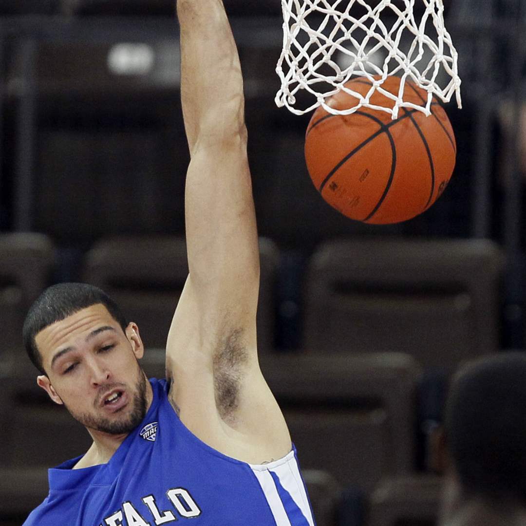 Bowling Green State University forward A'uston Calhoun (15) goes to the net against Buffalo forward Titus Robinson (30).