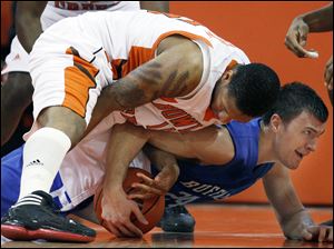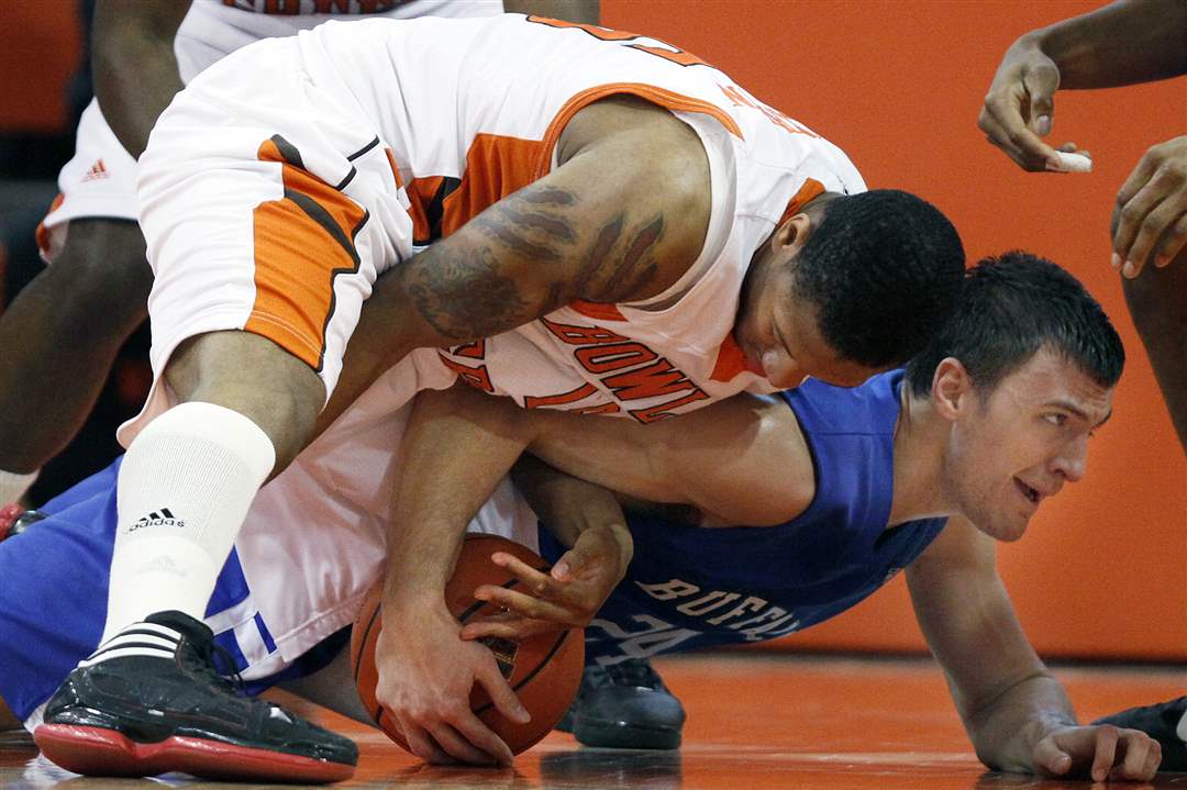 Bowling Green State University forward A'uston Calhoun (15) battles Buffalo guard Dave Barnett (24) for the ball.