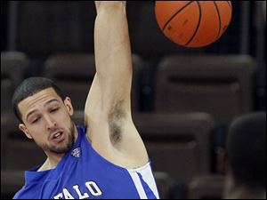 Bowling Green State University forward Scott Thomas (10) hits a three pointer against Buffalo guard Zach Filzen (5).