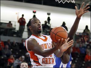 Bowling Green State University guard Dee Brown (22) goes to the net against Buffalo.