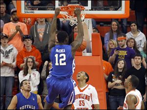 Buffalo forward Javon McCrea (12) dunks the ball against Bowling Green State University forward Cameron Black (35).