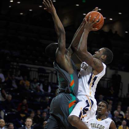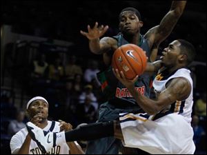Toledo's Julius Brown drives to the basket as a teammate and Florida A&M player watch.