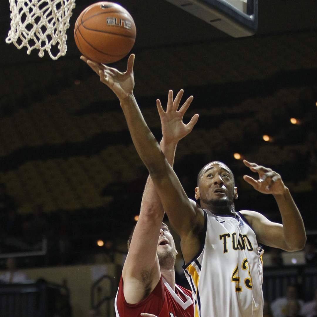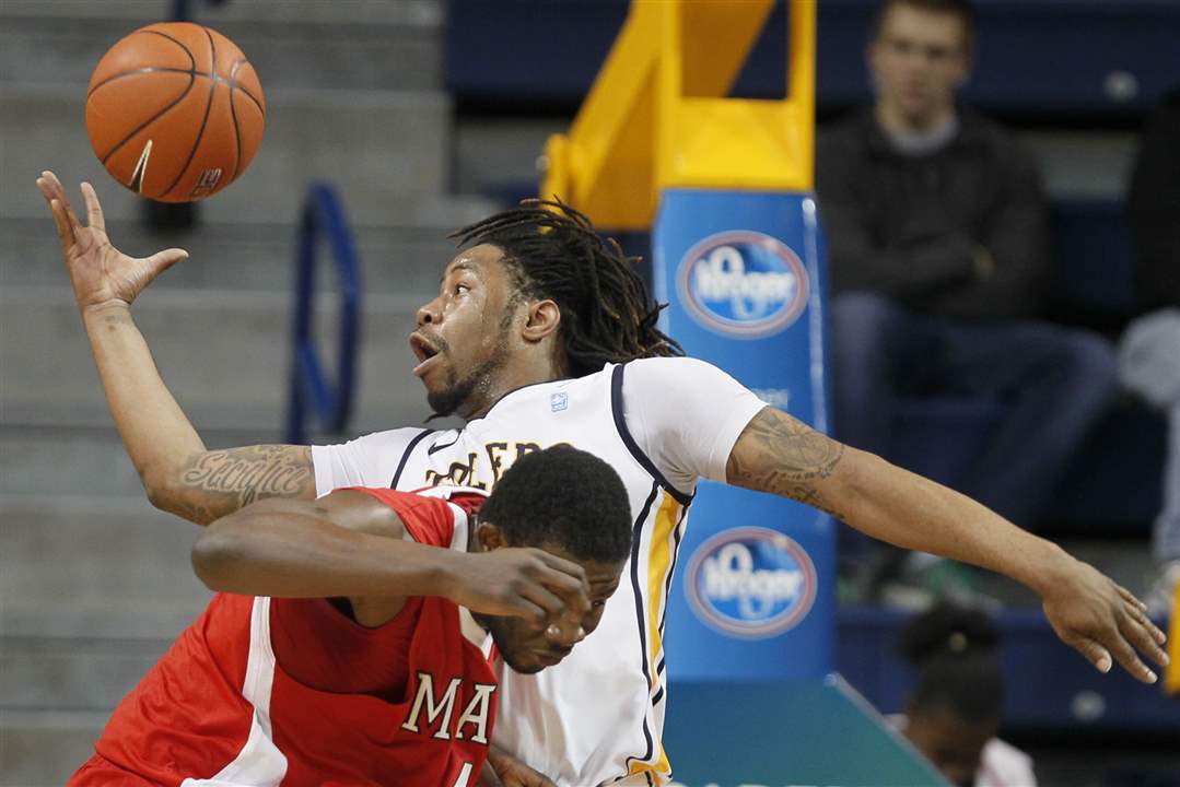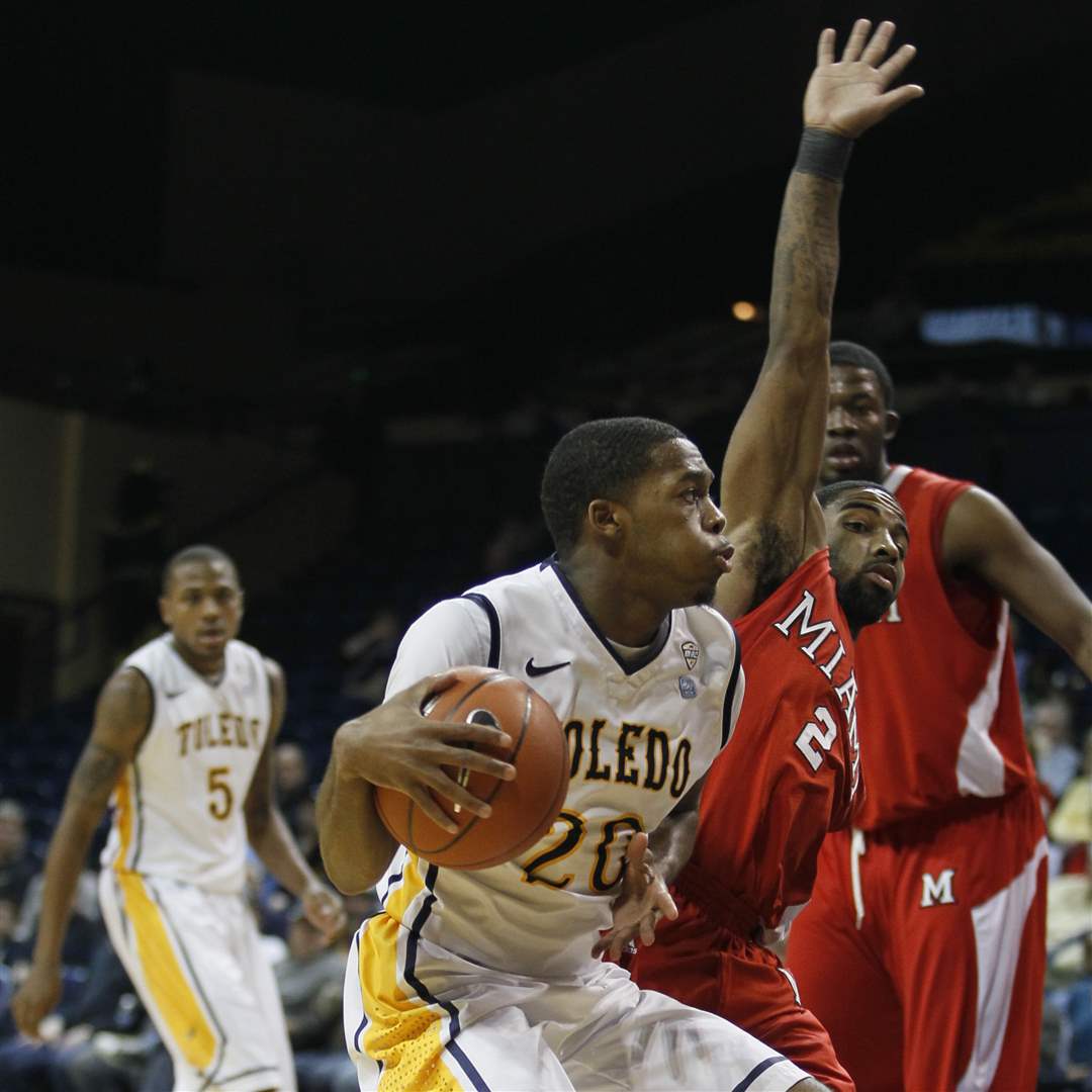 University of Toledo guard Julius Brown (20) looks for an opening against Miami guard Quinten Rollins (2).