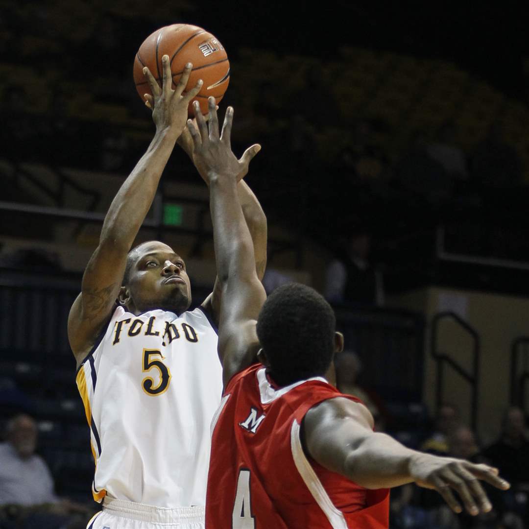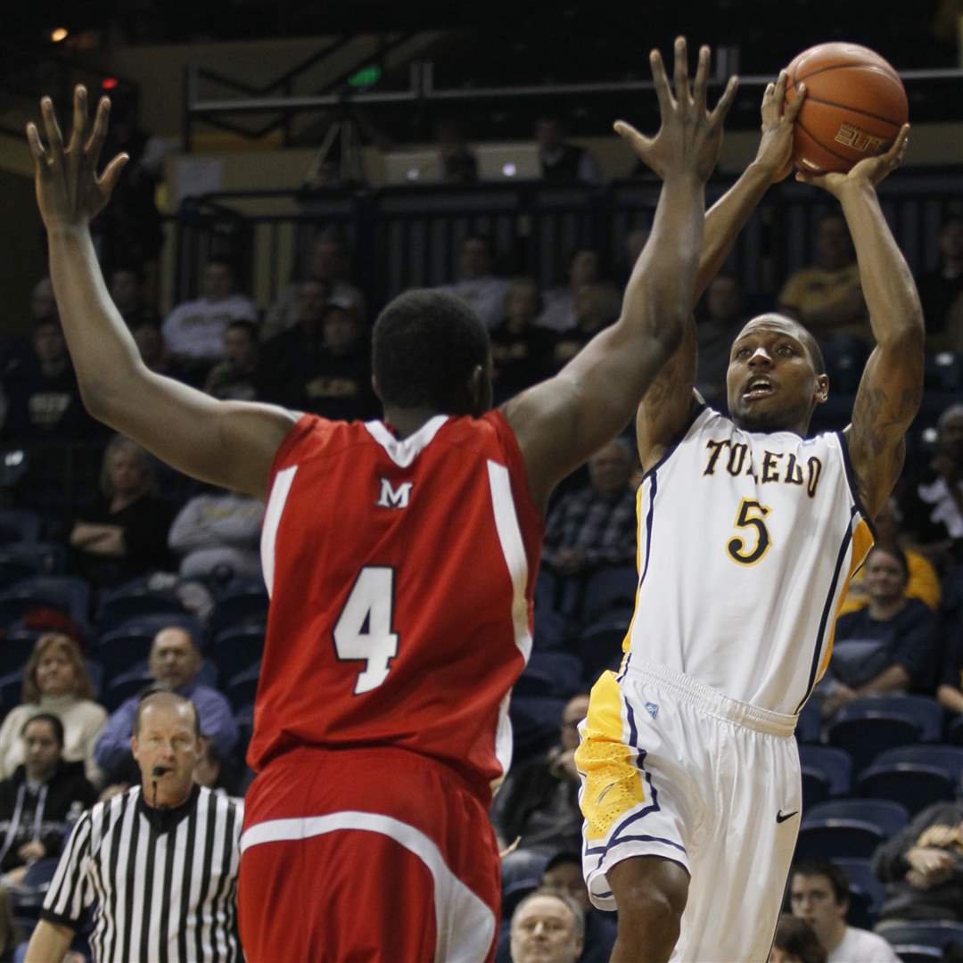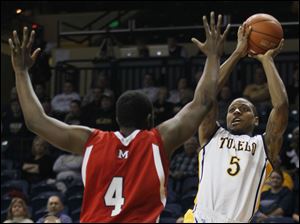 University of Toledo guard Rian Pearson (5) takes a shot against Miami forward Julian Mavunga (4).