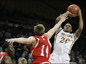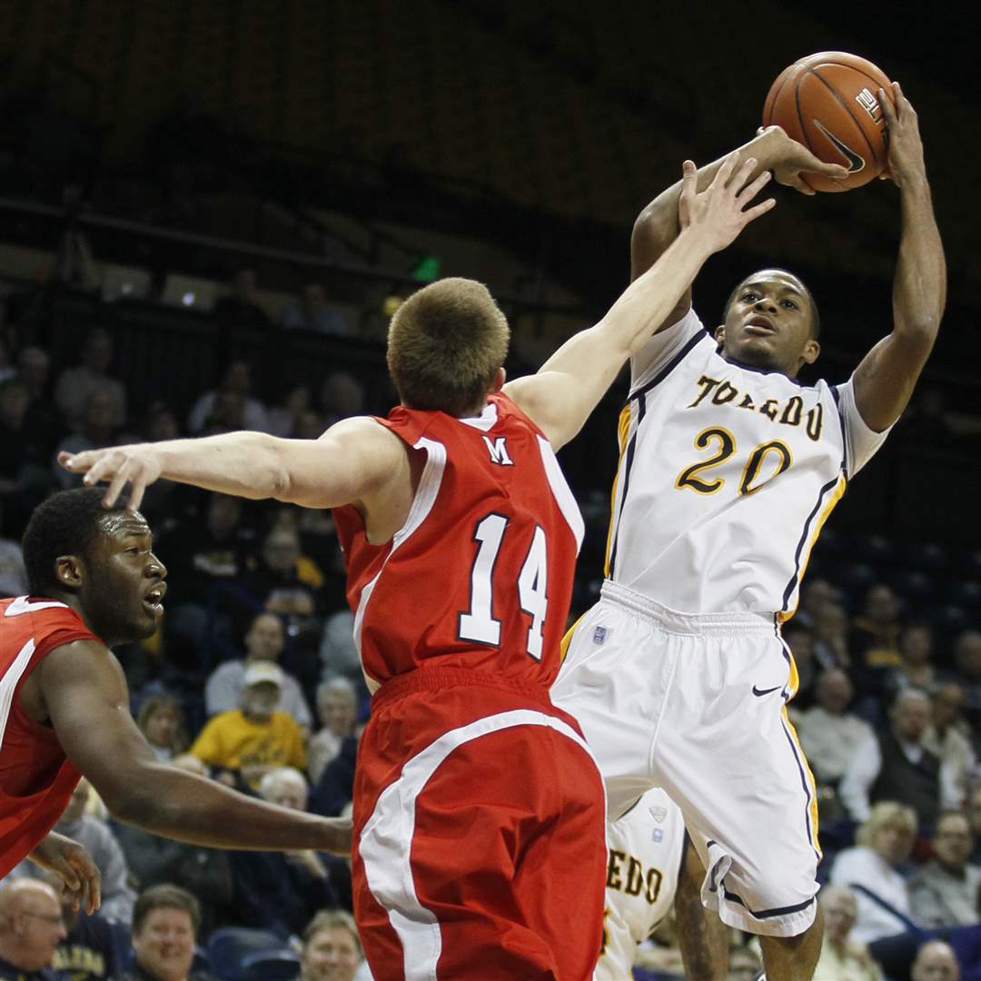 University of Toledo guard Julius Brown (20) takes a shot against Miami guard Brian Sullivan (14).