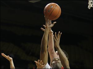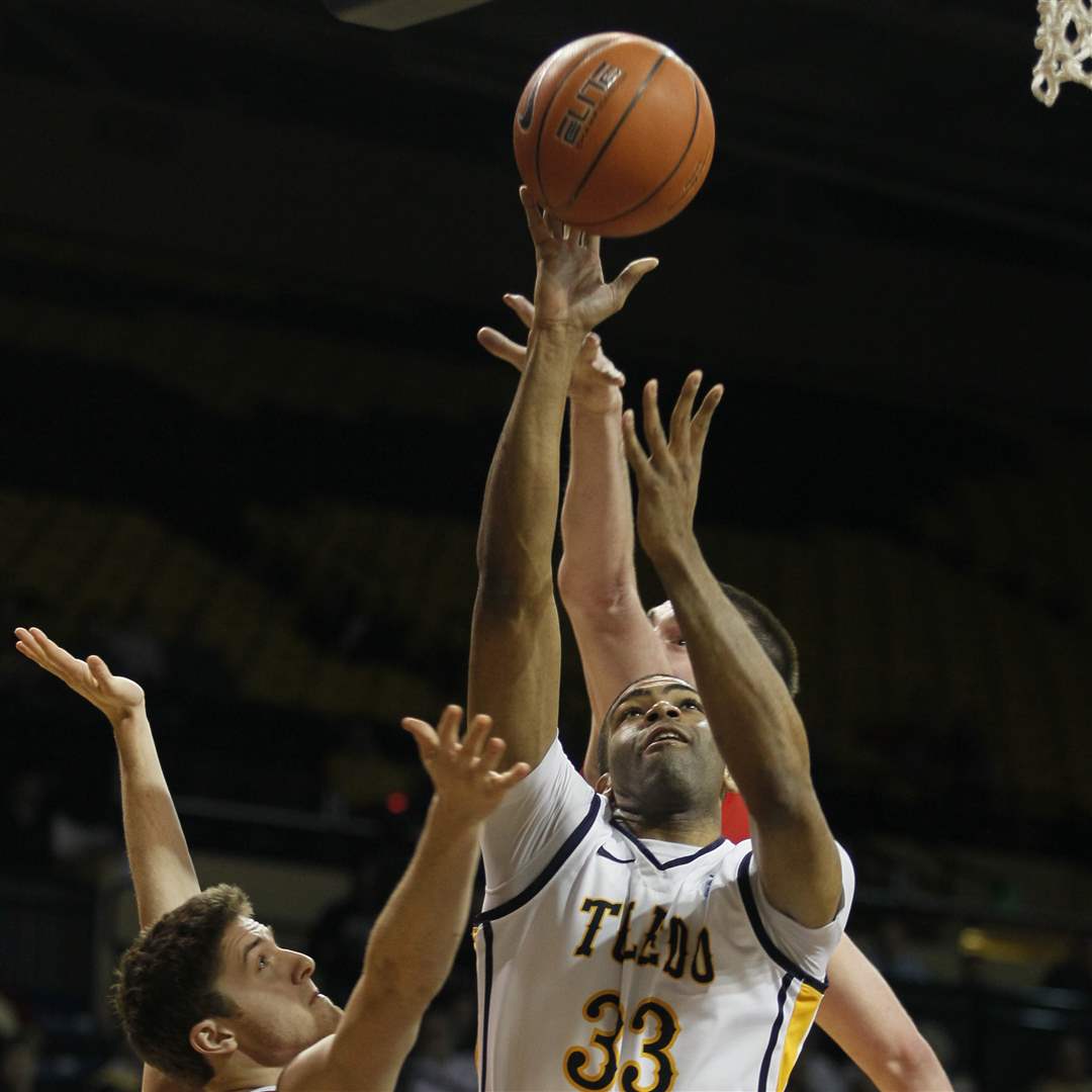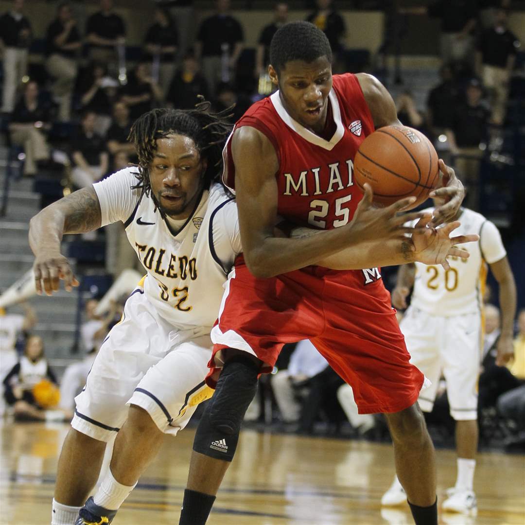 University of Toledo forward Reese Holiday (32) battles Miami forward Julian Mavunga (4) for a rebound.