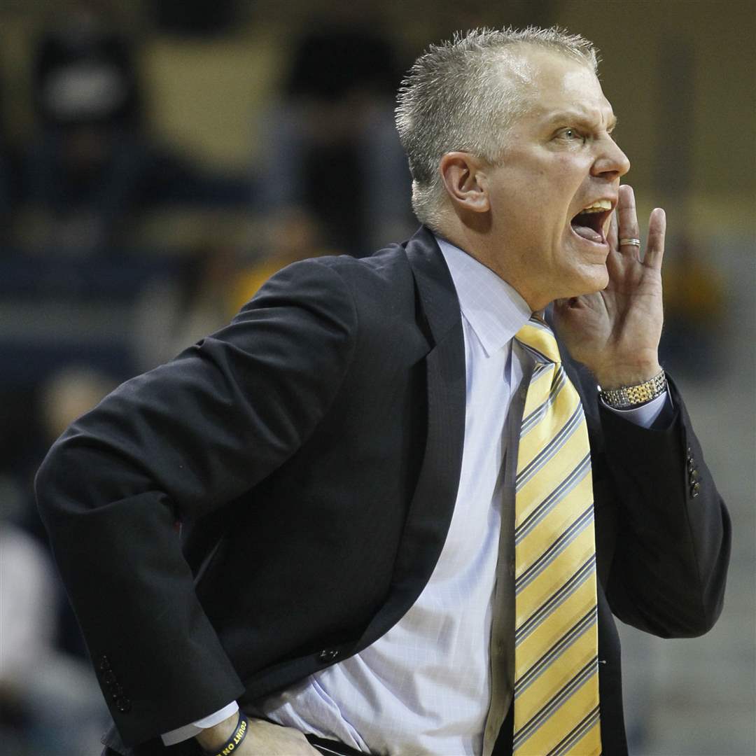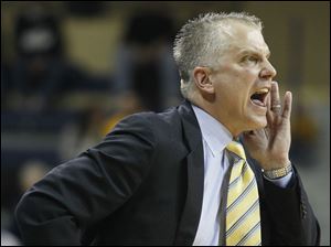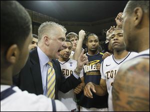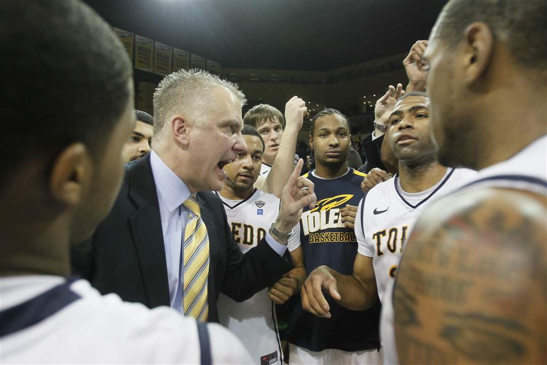 University of Toledo head coach Tod Kowalczyk talks to his team after they defeated Miami in the first round of the MAC tournament..