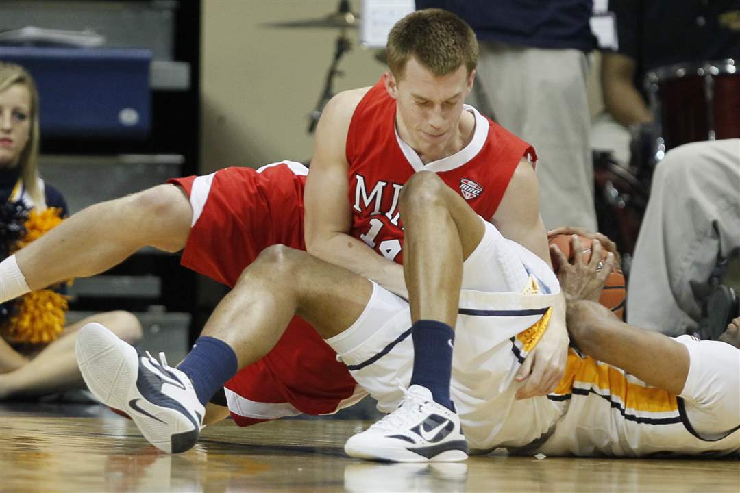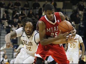 University of Toledo guard Curtis Dennis (33) battles Miami guard Brian Sullivan (14) for a loose ball.