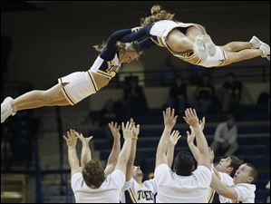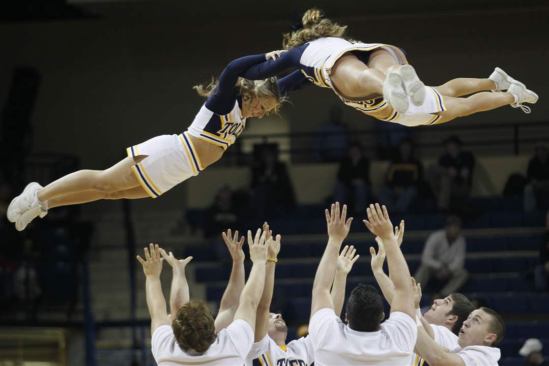 University of Toledo cheerleaders perform during the first round of the MAC tournament Monday.