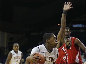 University of Toledo guard Curtis Dennis (33) goes to the net against Miami guard Will Sullivan (13).