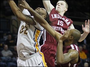 Toledo forward Matt Smith (43) shoots over Indiana University-Northwest's Don Davenport (44) and Adam White (15).