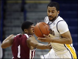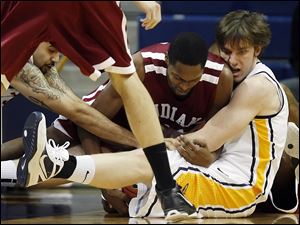 Toledo guard Rian Pearson (5) and Indiana University-Northwest forward Don Davenport (44) scramble for a loose ball.