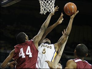 Toledo guard Julius Brown (20) goes to the net against Indiana University-Northwest.