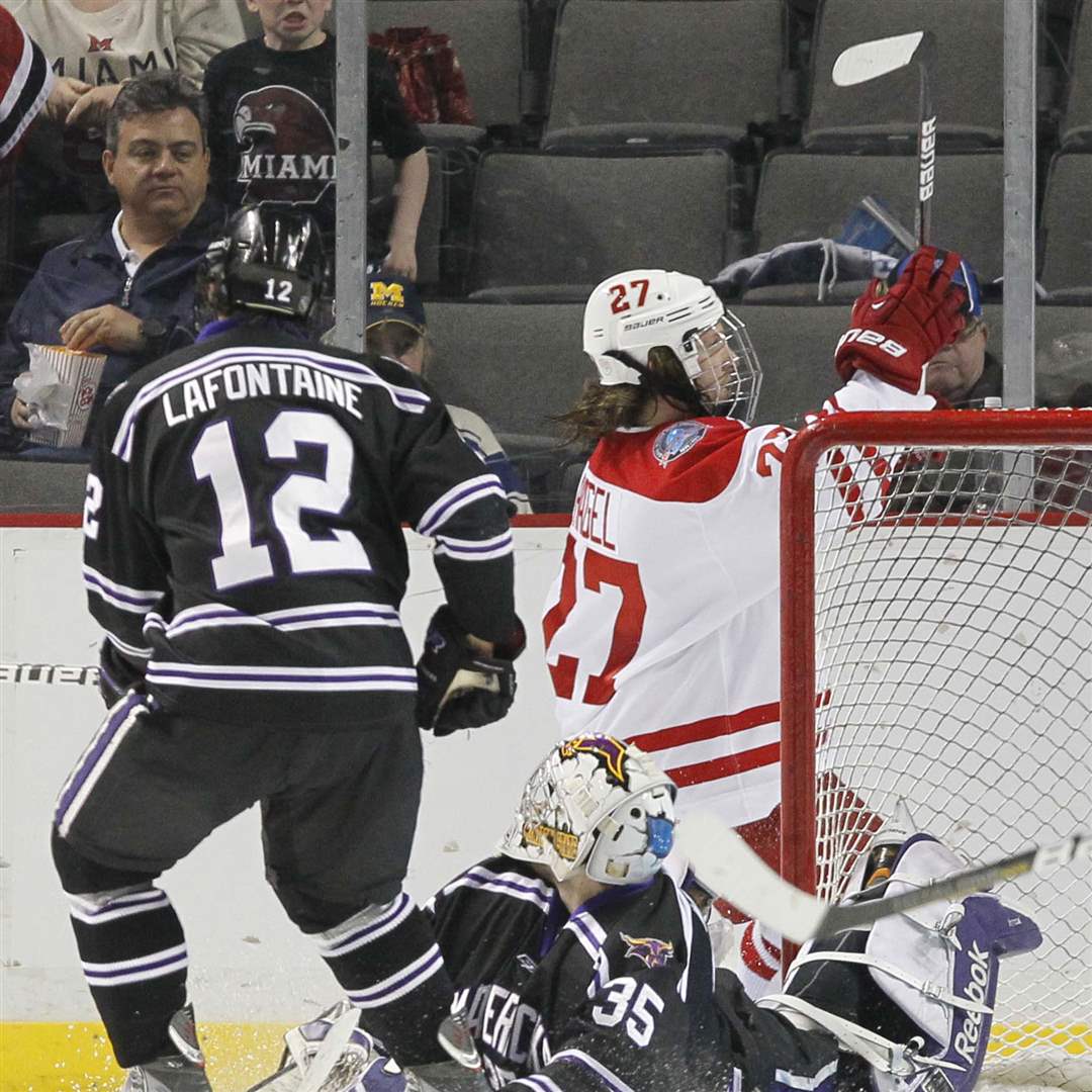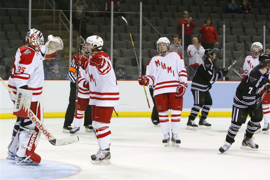 Miami goalie Ryan McKay, 35, celebrates with Taylor Richart, 2, and teammates after the RedHawks won.