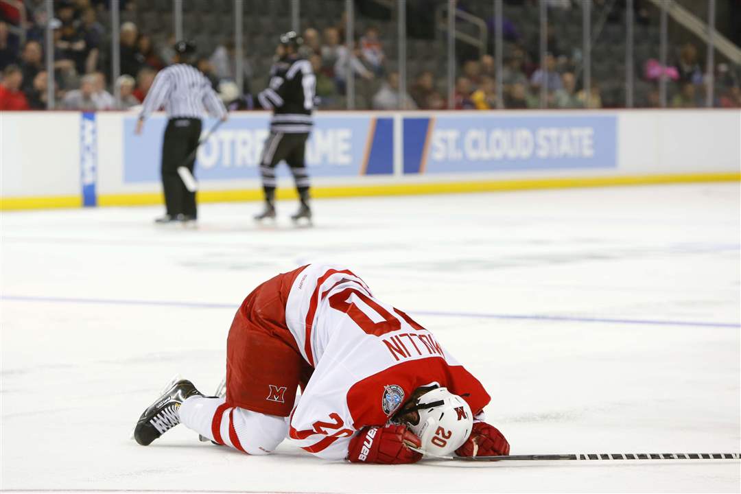 Miami Redhawks player Jimmy Mullin, 20, lays on the ice after being hit by Minnesota State's Evan Mosey during the first period. Mosey received a five minute penalty for the hit.