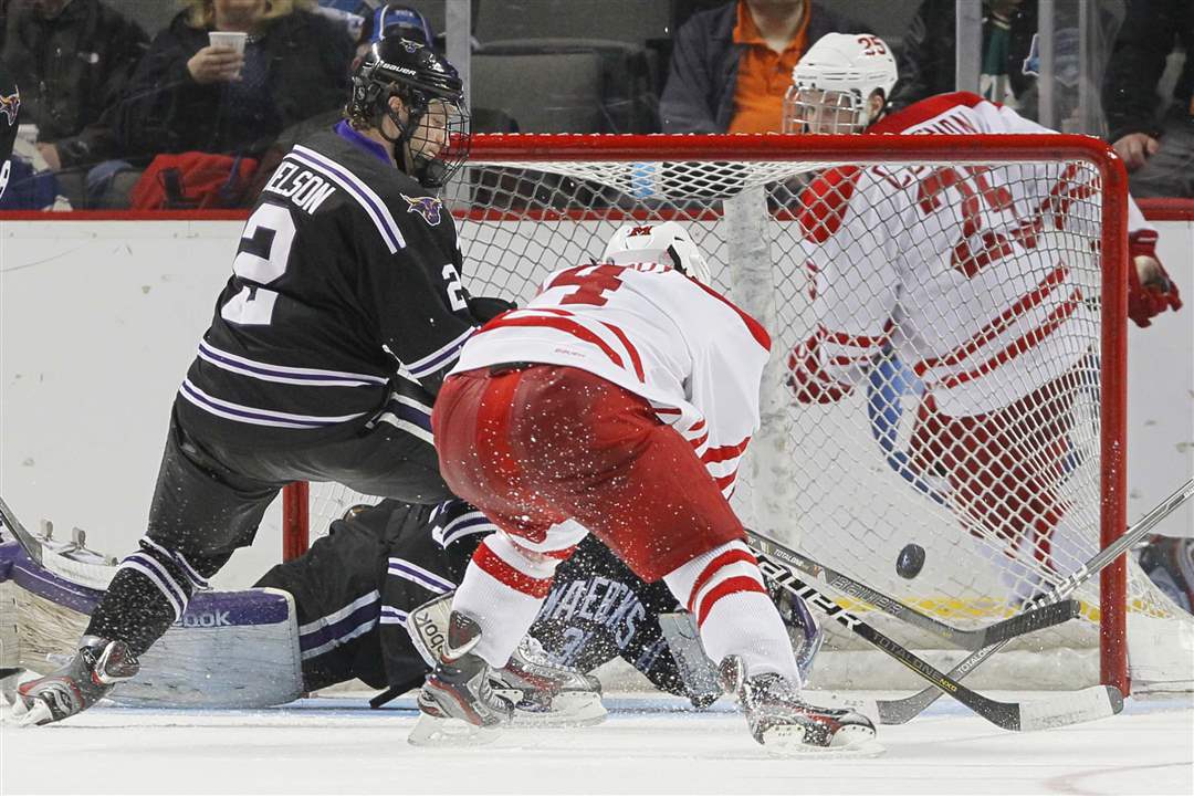 Miami Redhawks player John Doherty, 18, shoots behind him and toward Minnesota State goalie Stephon Williams.