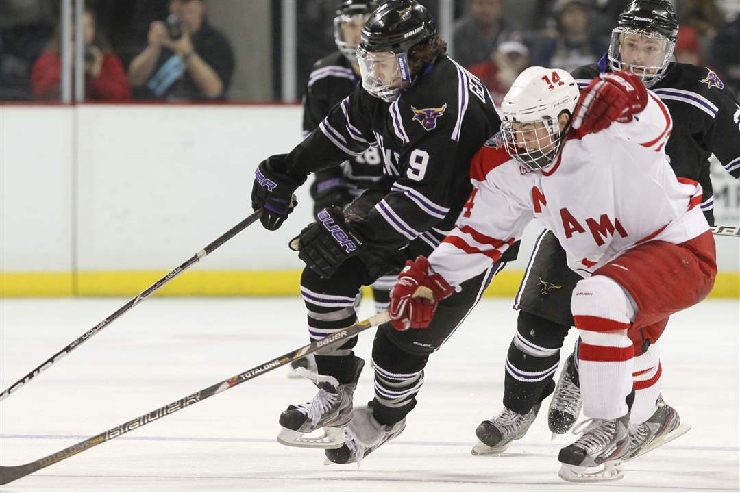 Minnesota State's Bryce Gervais, 9, and Miami Redhawks player Cody Murphy, 14, battle for the puck.