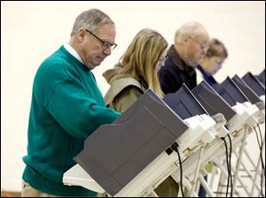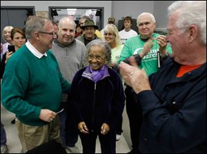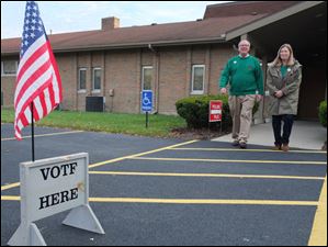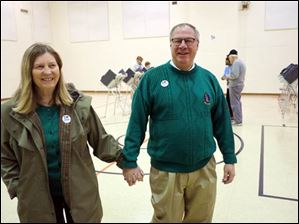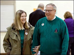 CTY collinsvotes06p Toledo mayoral candidate D. Michael Collins, right, and Sandra Drabik, his wife, wait to check-in to vote at the polling place at Church of the Cross on Cass Road, on election day, Tuesday, November 5, 2013. The Blade/Dave Zapotosky