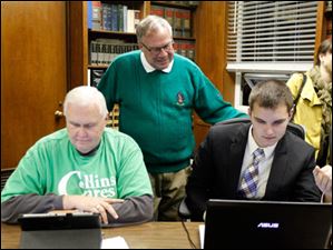 D. Michael Collins, center, looks over the shoulders of Robert Reinbolt,, left, and Christopher Fofrich, right, while waiting for the returns.