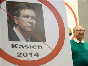 D. Michael Collins stands next to an anti-Kasich sign giving an acceptance speech.