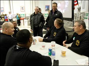 The Toledo Police Patrolman's Association Union President Dan Wagner, center standing, speaks with a table of law enforcement.