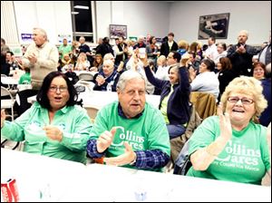 Supporter Jan Harmon applauds D. Michael Collins during his acceptance speech.