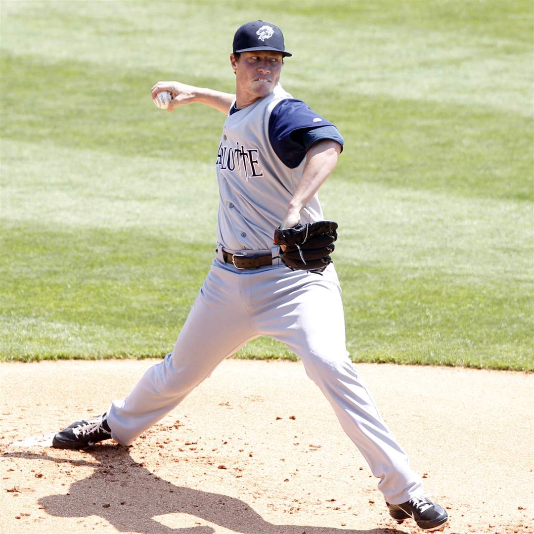 Toledo Mud Hens' Duane Below pitches the ball to a Charlotte Knights' player during their game at Fifth Third Field Sunday, May 8.