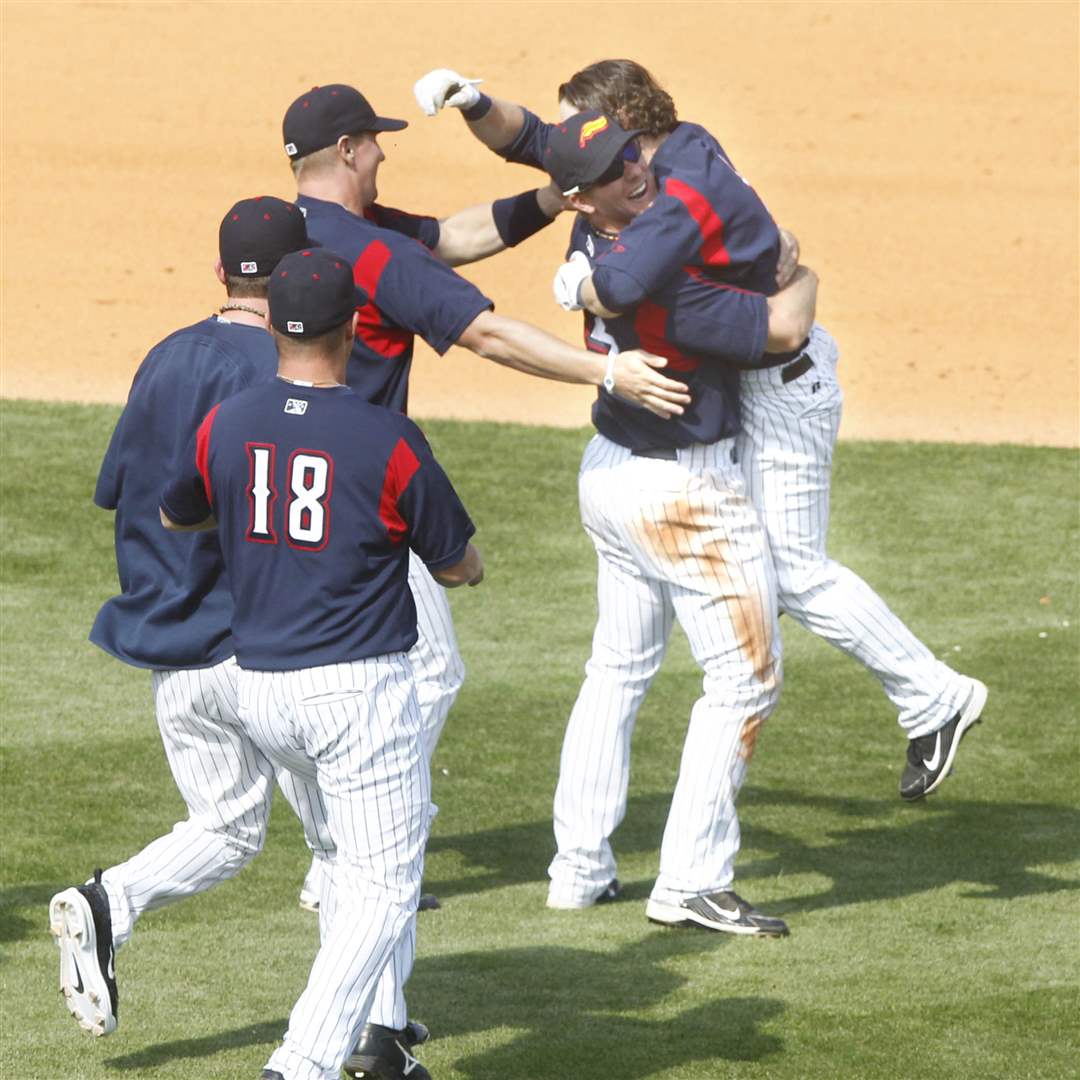 Toledo Mud Hens' Ryan Strieby picks-up Will Rhymes after Rhymes drove in the winning run.