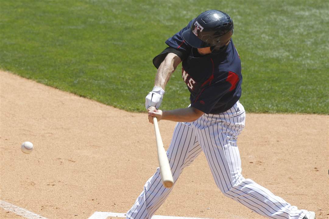 Toledo Mud Hens' Will Rhymes makes contact with the ball.