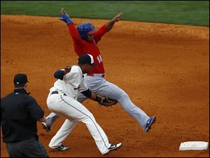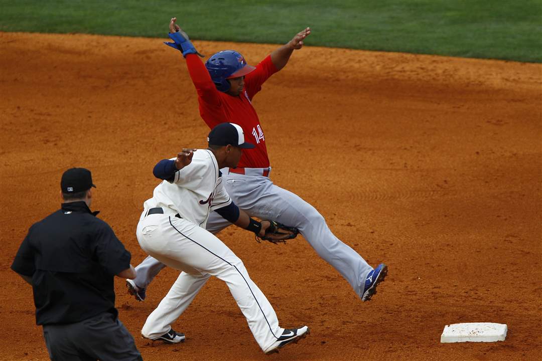 Buffalo's Moises Sierra leaps for second base as Toledo's Argenis Diaz attempts to tag him.