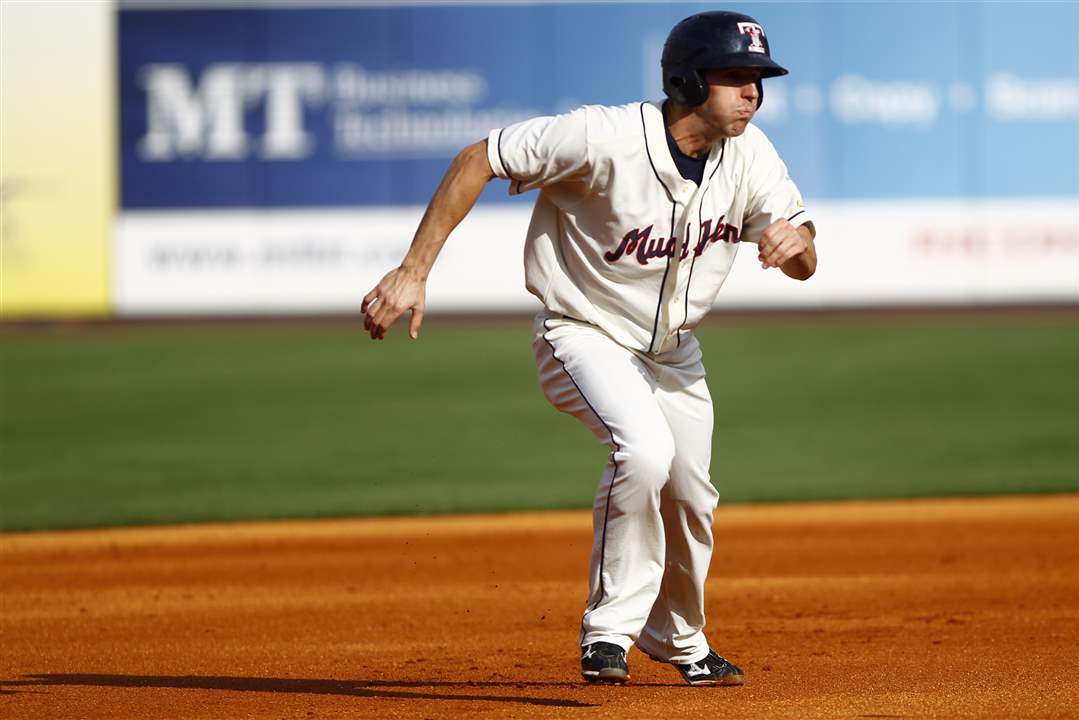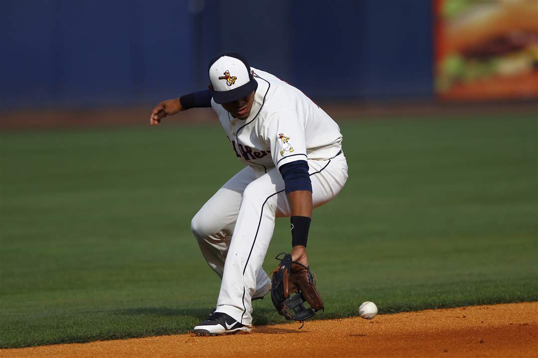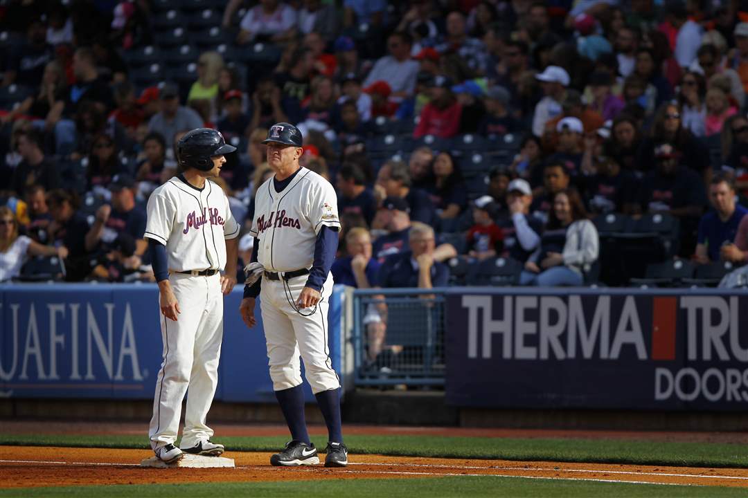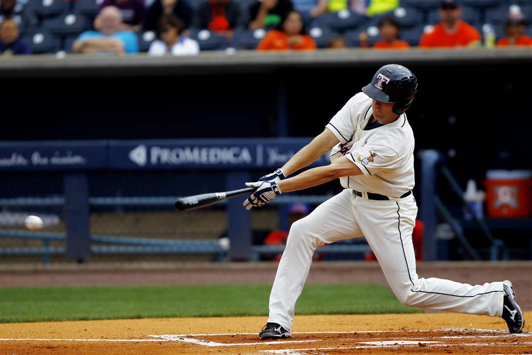 The Mud Hens' Ben Guez stands at first base after hitting a single.