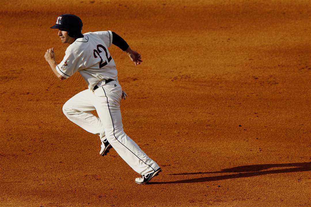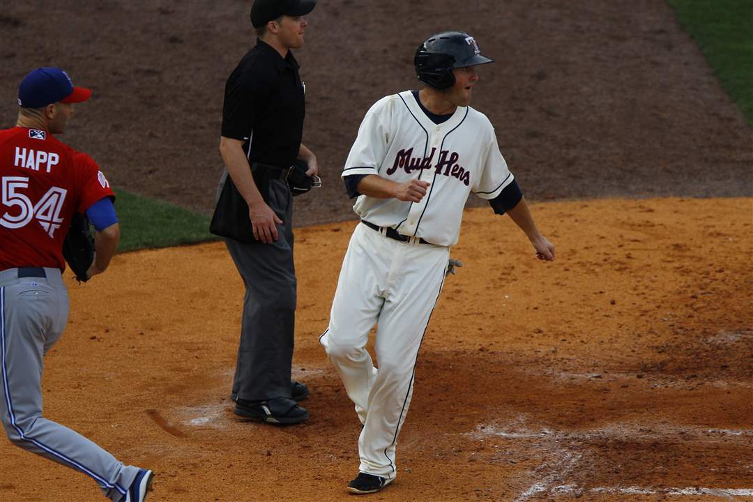 The Mud Hens' Ben Guez runs for third base safely for a triple.