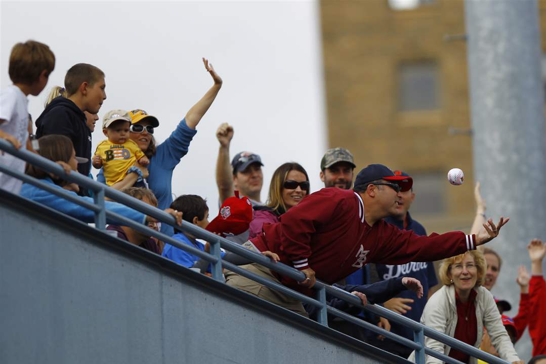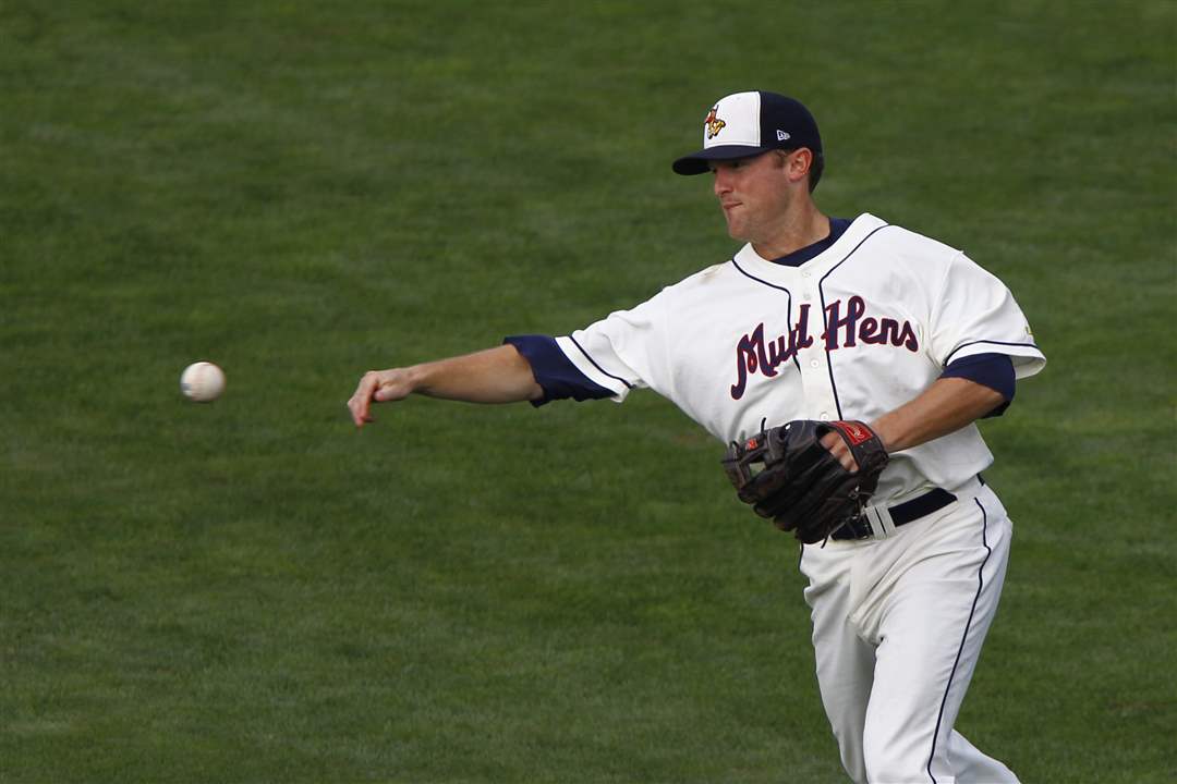 Toledo's Danny Worth throws a ball back to the infield after making a catch.