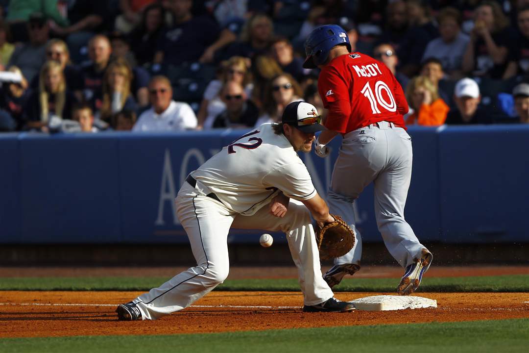 Toledo's Jordan Lennerton reaches for a throw, but Buffalo's Mike McCoy is safe at first base.