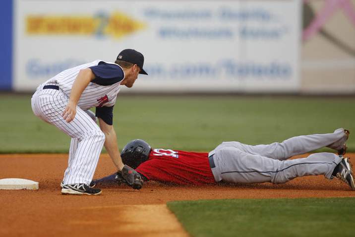 Toledo Mud Hens player Danny Worth (8) can't get the tag down in time as Columbus Clippers player Ezequiel Carrera steals second in the first inning.