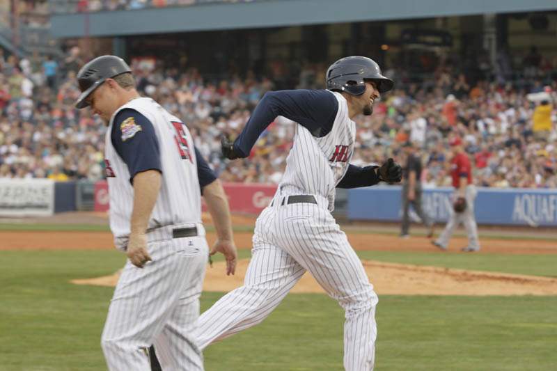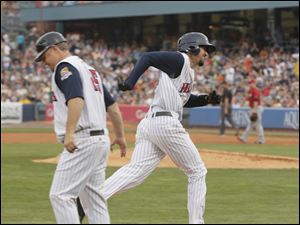 Toledo Mud Hens player Nick Castellanos (23) is congratulated by manager Phil Nevin after hitting a two-run homer in the first inning.
