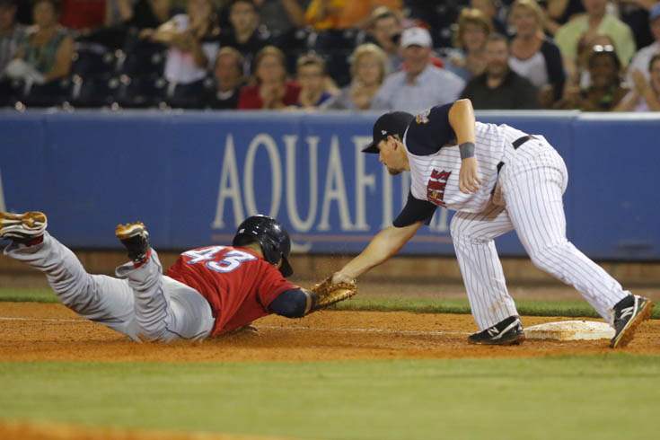 Toledo Mud Hens first baseman Jordan Lennerton (12) tags out Columbus Clippers player Chun Chen (43) to complete a triple play and end the game.