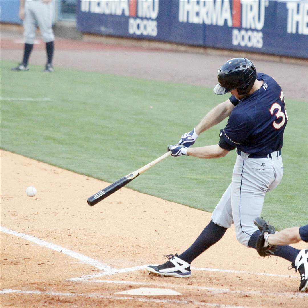 The Mud Hen's Jordan Lennerton connects with the ball.