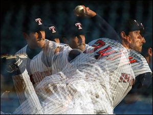 Mud Hens pitcher Drew VerHagen throws against the Columbus Clippers in this multiple exposure image.