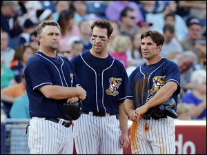 From left, Mud Hens manager Phil Nevin, right fielder Danny Dorn, and DH Mike Cervenak talk during a pitching change.