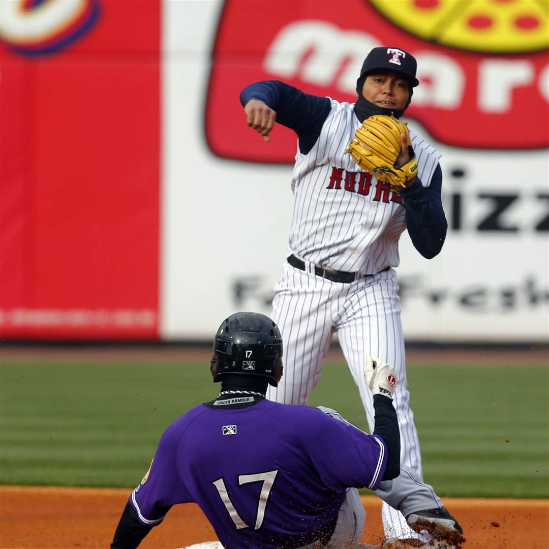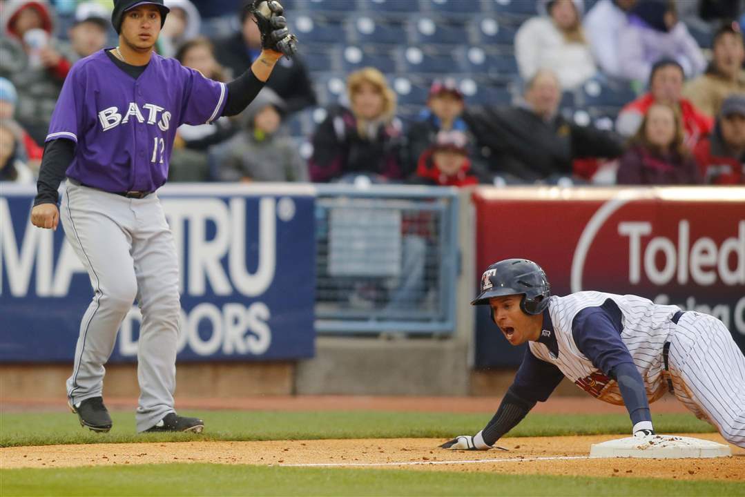 Toledo Mud Hens player Gustavo Nunez (3) is safe back at second with a double.